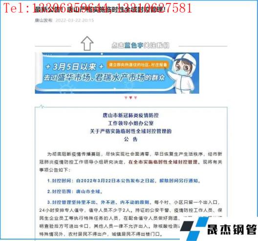 3月22日20時許,唐山發(fā)布《關(guān)于嚴(yán)格實(shí)施臨時性全域封控管理的公告》:自本公告發(fā)布之日起,唐山市實(shí)施臨時性全域封控管理。除核酸檢測以及應(yīng)急突發(fā)事件等特殊情況外,農(nóng)村居民不得出戶,城鎮(zhèn)居民不得出樓門口。